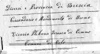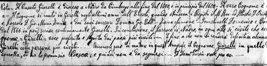 La famille GIARELLI est descendue de Cimbergo à Nadro à la fin du 16ème, ou au début du 17ème siècle. Le véritable nom de famille est GIRELLI. C'est ainsi qu'il a toujours été écrit par le prêtre Martino Ercoli de Bienno tant qu'il a pu tenir les registres et par ses prédécesseurs . Le nom se transforma en GERELLI quand Don Christofo Gaioni tint les registres, cette orthographe fut suivie par ses successeurs. La seule exception vint de Giovanni Barbetti, lequel selon la prononciation paysanne et le registre de la commune (à partir de 1866) écrivit constamment GIARELLI. |