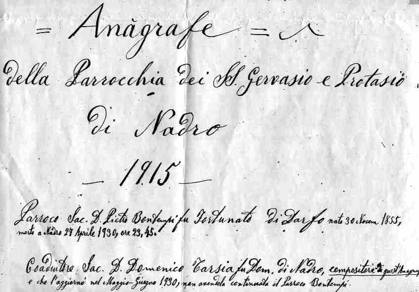 Les informations concernant l'origine de la famille Gerelli sont extraites de l'Anagraphe della Parrochio dei St Gervasio e Protasio di Nadro rédigé en 1915 par le prêtre Domenico TARSIA :