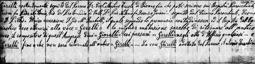 En conclusion : le curé de Nadro, dans tout acte, civil ou ecclésiastique, doit s'en tenir à l'orthographe de GERELLI. Le meilleur changement serait de revenir à l'ancien nom GIRELLI qui est la forme préférée et suivie par les régions les plus civilisées. Tant qu'on aura pas pris une décision définitive sur la forme de ce nom, celui qui tient les registres dira GIARELLI avec les paysans, GERELLI dans les actes officiels de quelque nature qu'ils soient et GIRELLI avec les personnes de bonne éducation. Il est recommandé cependant de changer dans ces registres le nom de GIARELLI en celui de GERELLI tant que l'on ne sera pas revenu au nom ancien de GIRELLI. |